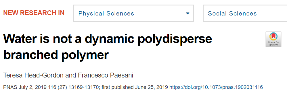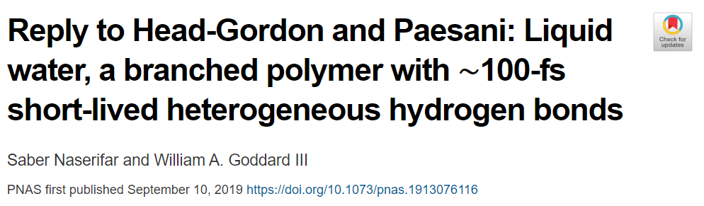 Goddard发了个PNAS,说液态水其实是多分散分支聚合物。妥妥的一个标题党。作者里要是把Goddard的名字去掉,估计是发不了PNAS,甚至连JPCA都未必会要。(强烈怀疑之前投过Nature之类的被拒了)