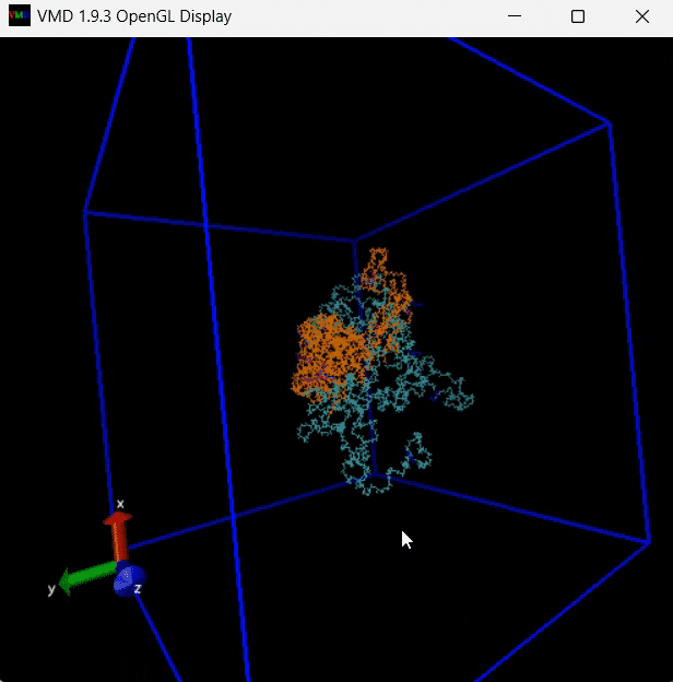 我首先使用packmol生成了十条链堆叠于box中心的体系,填充tip3p溶剂后,使用科音GMX初级班中的EM\NVT\NPT模板依次平衡,然后尝试先进行2ns的MD,看看链段的模拟情况。可以看到橙色的PCL链段收缩,蓝色的PEG链段比较舒展,有形成自组装结构的一点特征。