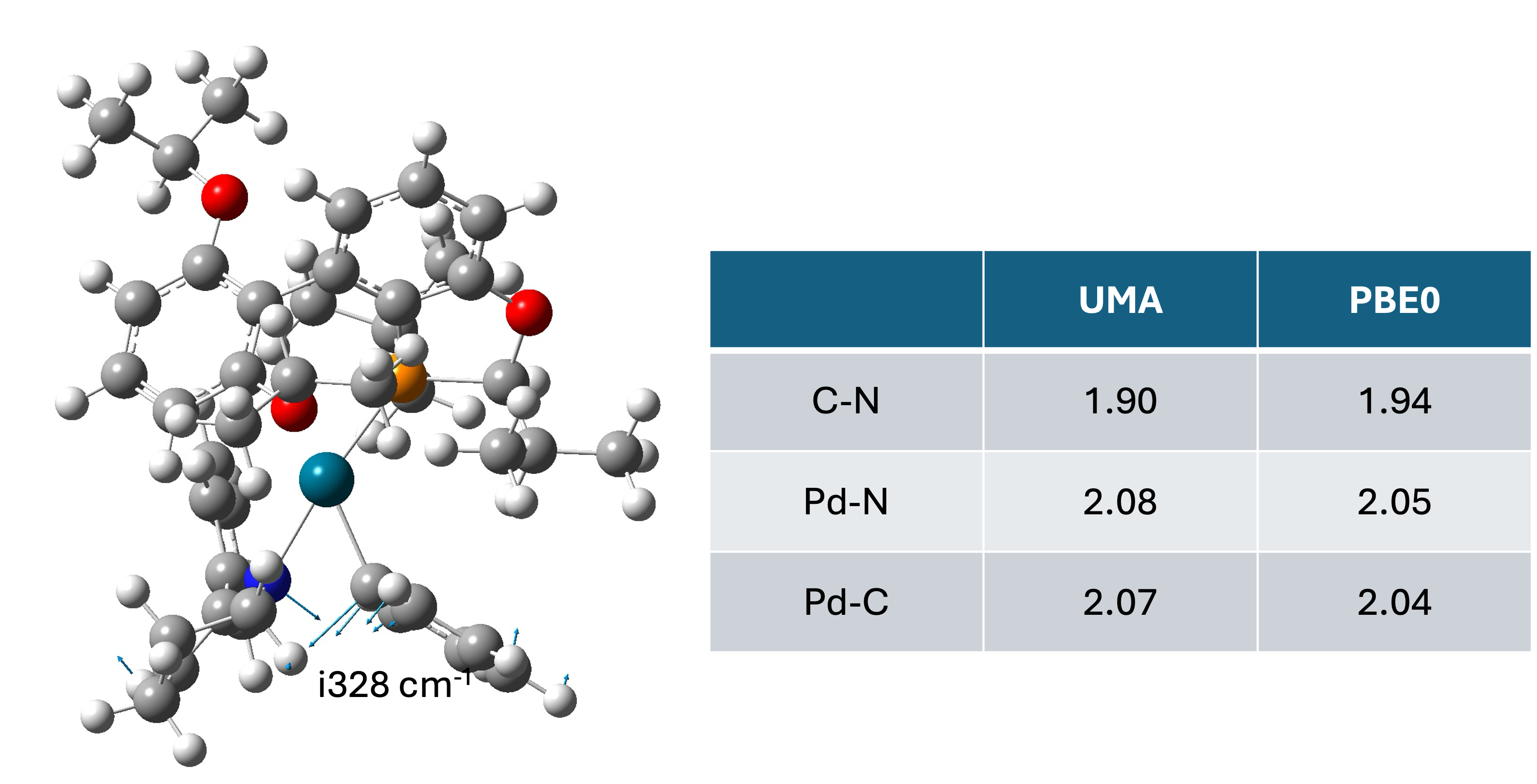 复制代码需要注意的是UMA本身只能预测分子的受力,因此calcfc和freq所需的Hessian矩阵是由程序自动进行有限差分得到的。不过由于有限差分是在内部实现不涉及和Gaussian的通信,所以整体效率较高,对于这个过渡态体系一次频率计算仅耗时17.8s。这里理论上还可以通过批量推理或者使用@wzkchem5老师的O1NumHess进一步优化,不过考虑到程序的兼容性以及本身计算的绝对时间也不长,就没有进一步实现。以下是过渡态结构中的一些关键键长和PBE0结果的对比,可以说作为初猜已经非常可用了: